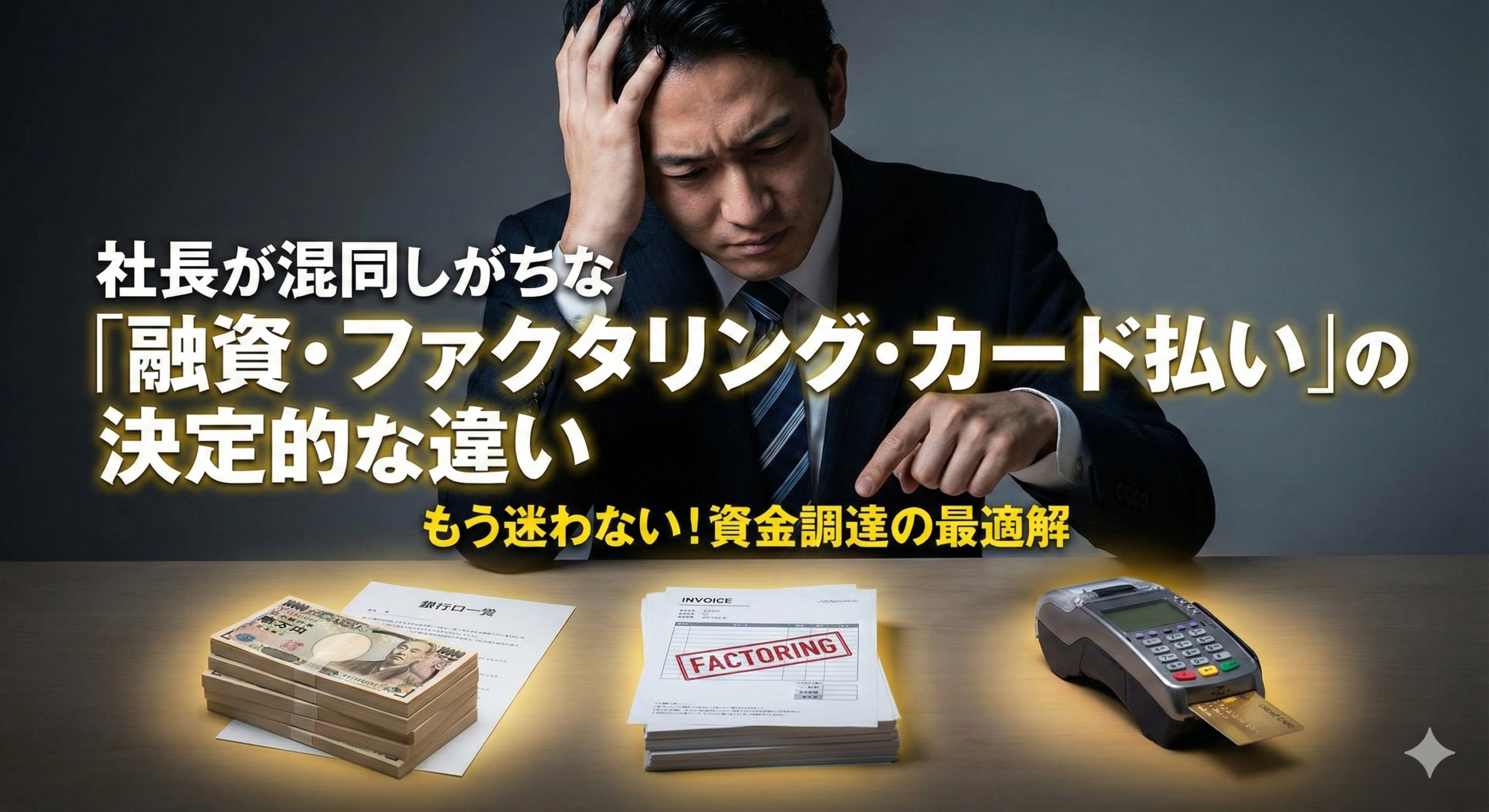 法人の資金繰りで使われる「融資」「ファクタリング」「カード払い」は、似ているようで本質はまったく別物です。